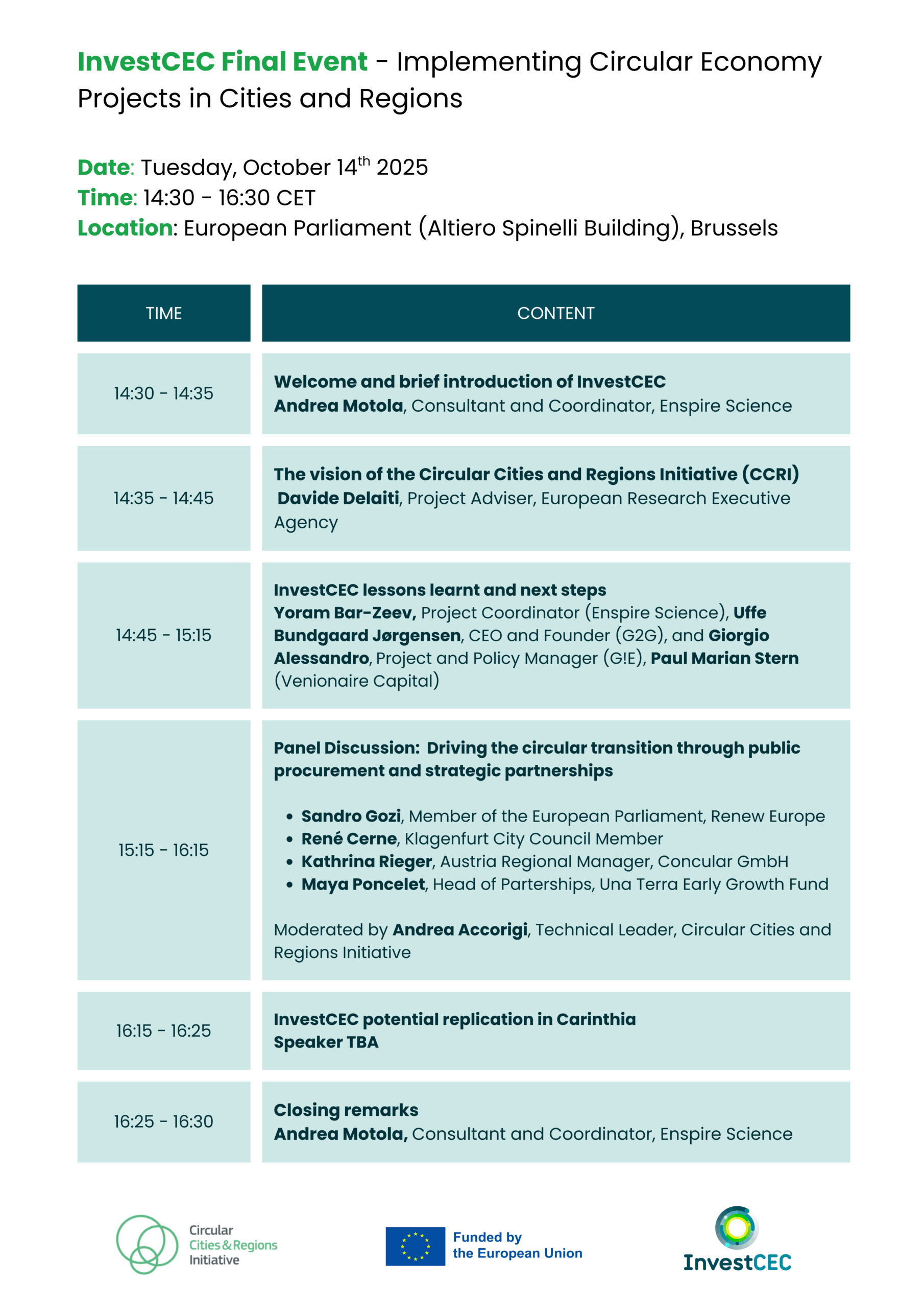 The InvestCEC project will host its final event at the European Parliament in Brussels on Tuesday, October 14th (14:30 – 16:30). InvestCEC was tested in the city of Klagenfurt, Austria, and will showcase its experience and main achievements in developing a replicable model to initiate circular economy projects in regions and cities.